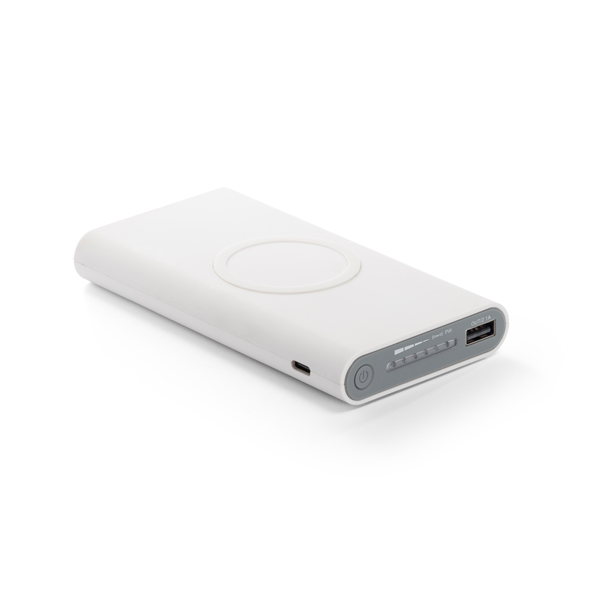 Bateria portátil wireless. ABS. Acabamento emborrachado. Carregamento do dispositivo por indução. Bateria de lítio. Capacidade: 11.000 mAh. Tempo de vida ? 500 ciclos. Com entrada 5V/2.1A, saída USB 5V2.1A e potência de carregamento 5W. Com indicador de carga e portas USB, micro USB e USB tipo C. Incluso cabo USB/micro USB para carregar a bateria. Fornecida em caixa presente. 135 x 75 x 20 mm | Caixa: 150 x 95 x 25 mm