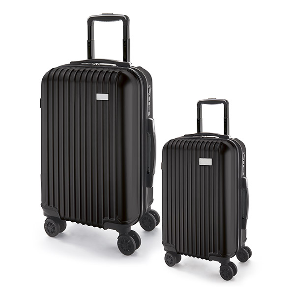 Conjunto de 2 malas de viagem executivo. ABS e PET. Interior forrado, com divisória. 4 rodas duplas giratórias. Pega extensível em alumínio, com mola (altura pega estendida mala cabine: 530 mm, altura pega estendida mala grande: 335 mm). Fecho de segurança com senha. Placa metálica removível, para fácil gravação. Capacidade: 33 L e 90 L. Peso: 2,70 e 4,20 kg. Mala cabine: 335 x 540 x 225 mm | Mala grande: 500 x 775 x 290 mm | Placa: 60 x 30 mm