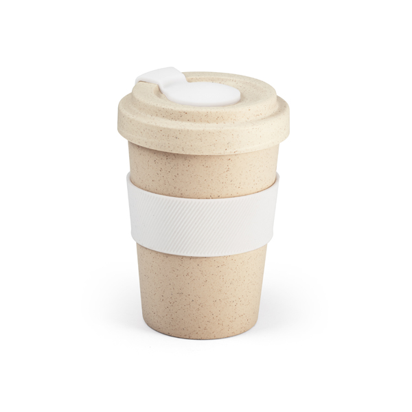 Copo para viagem. Fibra de bambu e PP. Com banda de silicone e tampa. Capacidade até 500 ml. Food grade. 95 x 140 mm