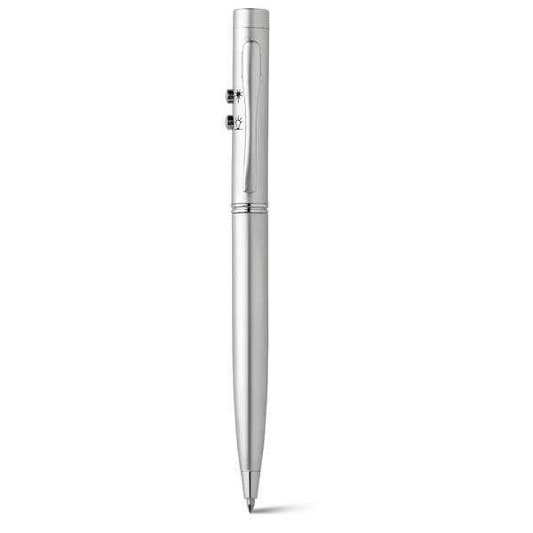 Esferográfica. Metal. Com ponteira laser e LED. Incluso 3 pilhas LR41. 1,5km de escrita. Em estojo com forro de veludo. 10 x 131 mm | Estojo: 170 x 50 x 20 mm