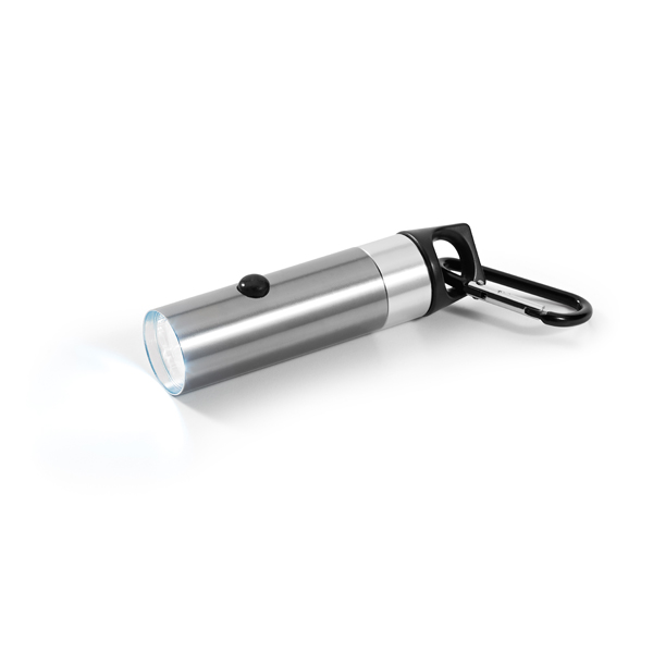 Lanterna. Alumínio. Com 6 LEDs, abridor de garrafas e mosquetão. Incluso 2 pilhas CR2032. 25 x 102 mm