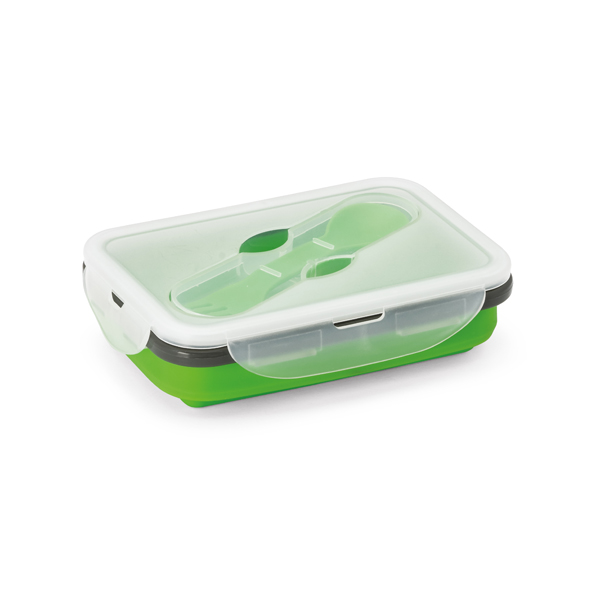 Marmita retrátil. Silicone e PP. Com 1 compartimento e talher 2 em 1 (garfo e colher). Capacidade: 640 ml. Food grade. 170 x 110 x 66 mm | Dobrada: 170 x 110 x 40 mm