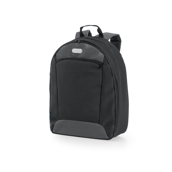 Mochila para notebook. 600D2Tone e 300D. Compartimento com divisória almofadada para notebook até 14'. Interior forrado e almofadado, com diversos bolsos. Bolso frontal. Parte posterior e alças almofadadas. Placa metálica removível com imã, para fácil gravação. 325 x 435 x 135 mm | Placa: 50 x 20 mm