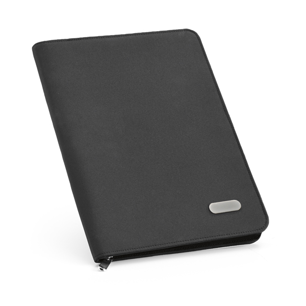 Pasta A4. Microfibra. Calculadora dual-power de 8 dígitos. Incluso pilha LR1130. Bloco: 20 folhas pautadas. Esferográfica não inclusa. 245 x 340 x 40 mm | Chapa: 45 x 15 mm